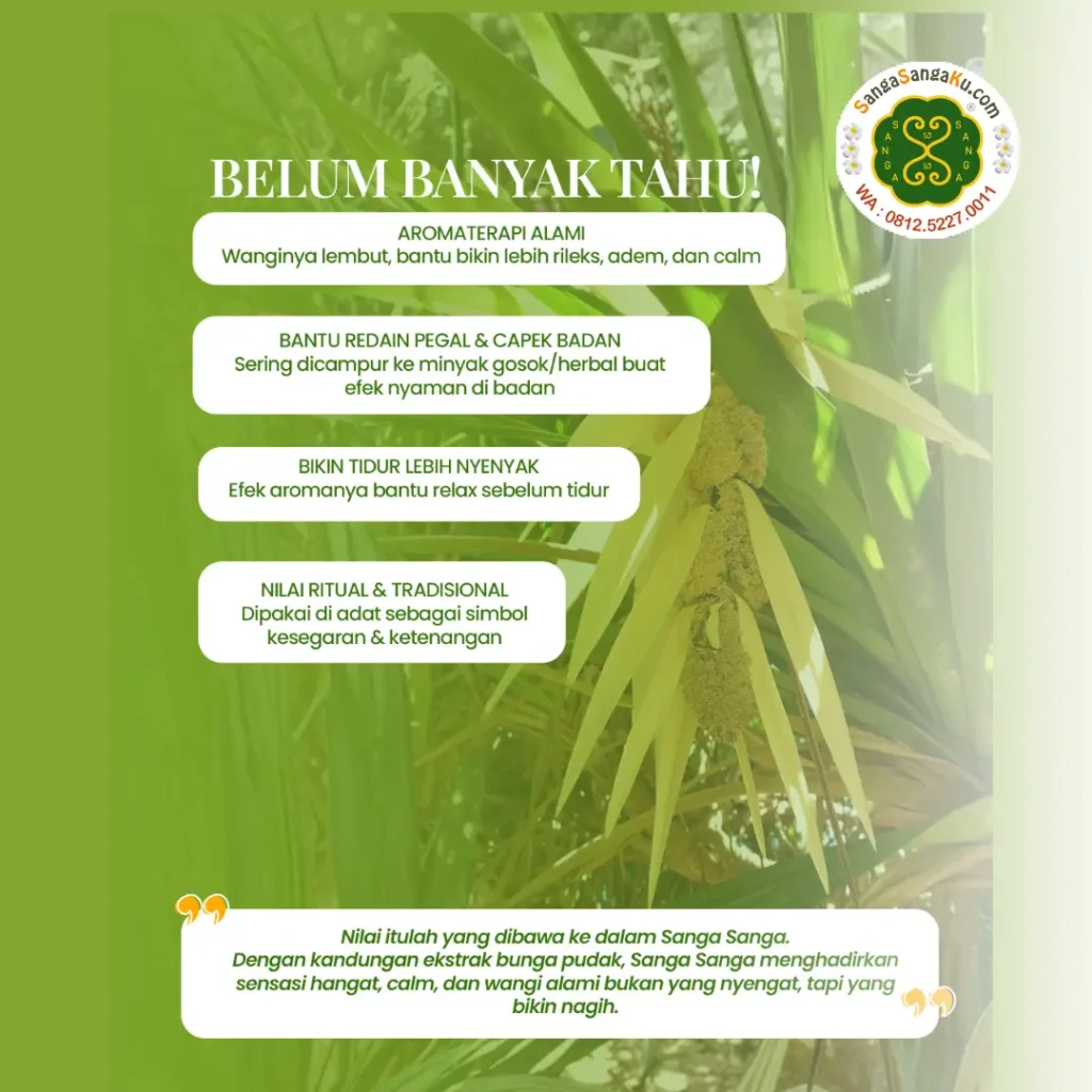 Menariknya, Bunga Pudak menjadi salah satu bahan rahasia dalam Minyak Sanga Sanga Ultimate, minyak balur herbal premium yang menggabungkan 140 tanaman obat Nusantara.